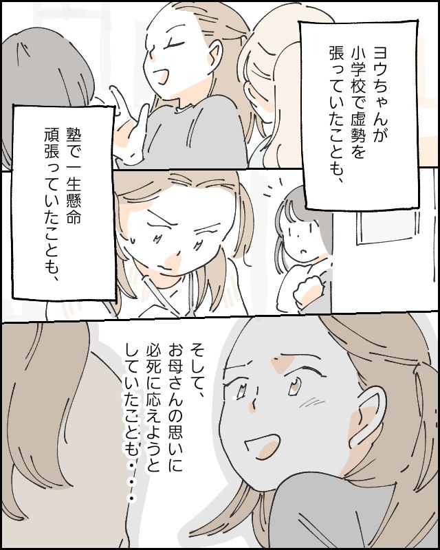 ヨウちゃんに責められても何も言い返さないアイちゃんは、ヨウちゃんが小学校で虚勢を張っていたことも、塾で一生懸命頑張っていたことも、そしてお母さんの思いに必死に応えようとしていたことも知っていました。