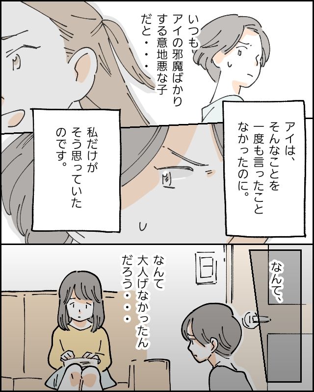 「いつもアイの邪魔ばかりする意地悪な子だと・・アイはそんなこと一度も言ったことなかったのに・・なんて大人げなかったんだろう・・」ママは自分だけがそう思っていたと感じて恥ずかしくなりました。