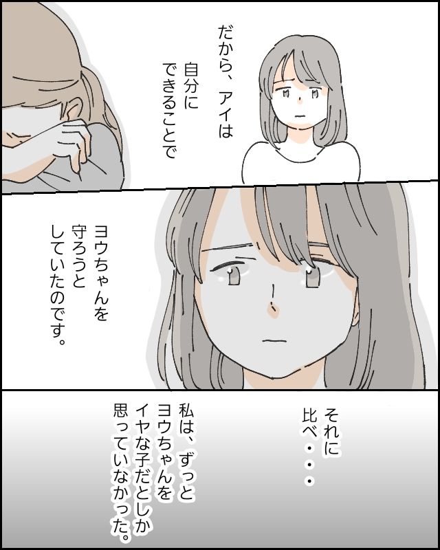 だから、アイちゃんは自分にできることでヨウちゃんを守ろうとしていたのです。そう思いながら「私はずっとヨウちゃんをイヤな子だとしか思っていなかった」と振り返るママ。