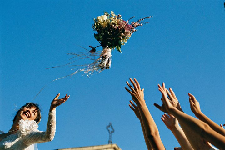 14世紀の英国が起源といわれるブーケトス。花嫁のドレスや持ち物に触れて幸せにあやかろうとしたゲストに向け、行われるようになったのだとか。現在では、ブーケを受け取った人が次の花嫁になれるとされ、日本でも人気の演出です。