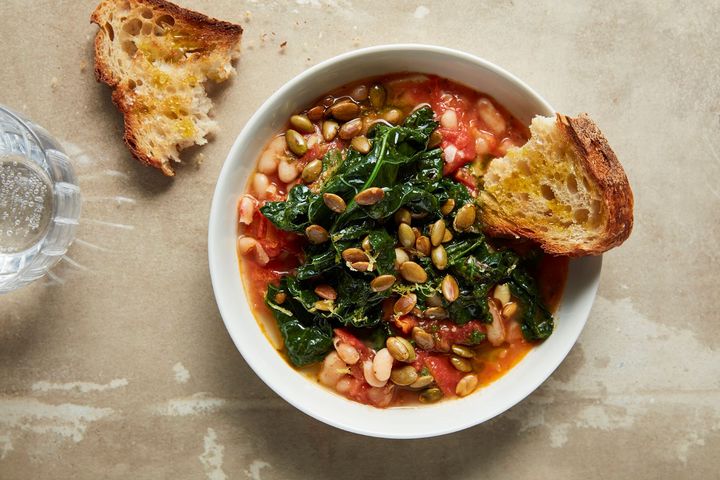 白いんげん豆とトマトのブレゼ - グリルドグリーンズ、ローストパンプキンシード