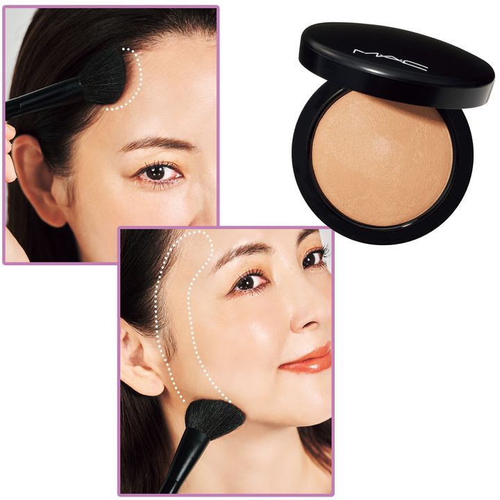 パウダーファンデ派は、同じくパウダータイプのシェーディングを選んで。粉含みの良い大きめのブラシを使うことで均一に塗布でき、自然に輪郭を引き締めてくれます。こめかみの生え際部分も忘れずに!