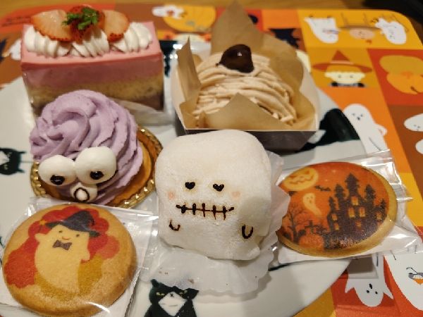 今回購入したのは、おばけ大福(350円)、紫いもモンブラン(430円)、苺のチョコムース(450円)、モンブラン(400円)、ハロウィンプリントクッキー(1枚150円を2つ)にしました。