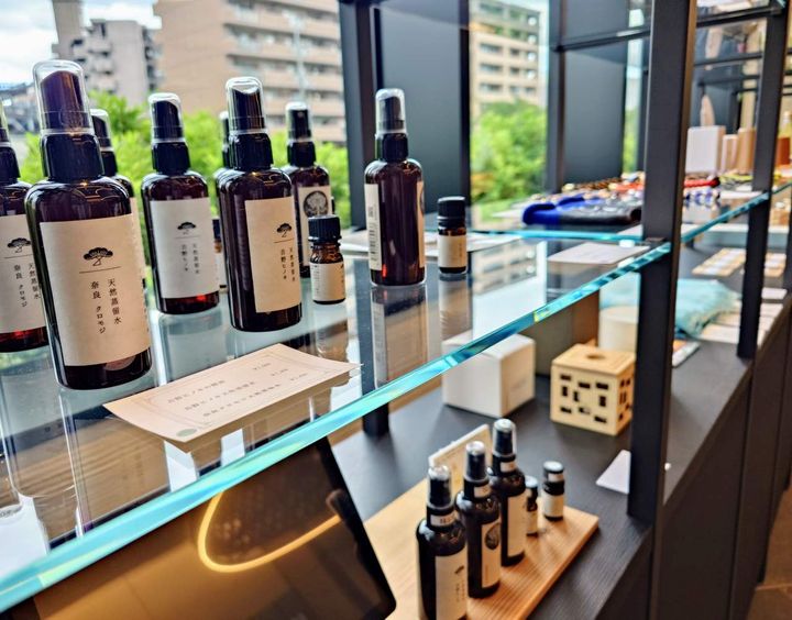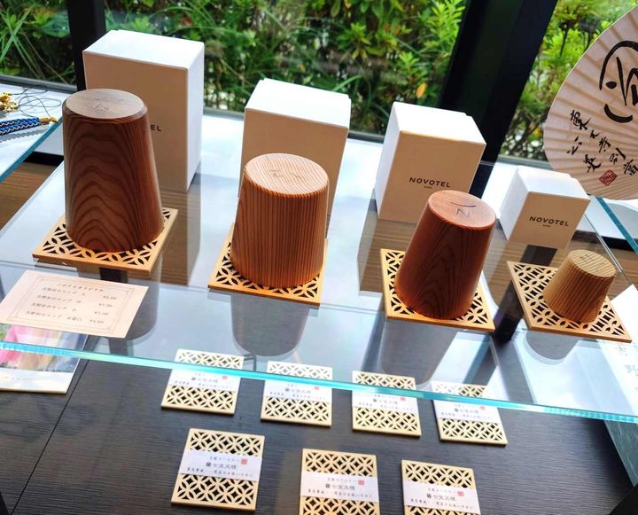 (写真)ノボテル奈良オリジナルの「吉野杉のコップ(大・中・小・お猪口)」(税込4,950円〜)。お客さんにも好評のウェルネスラウンジで香る「奈良の香り」の精油(税込1,200円〜)も販売され、自分用の旅の思い出やお土産に喜ばれています。