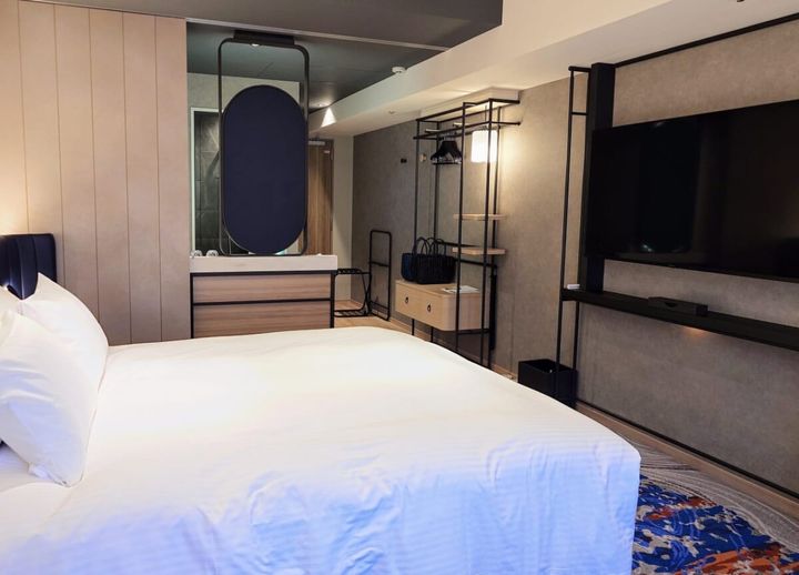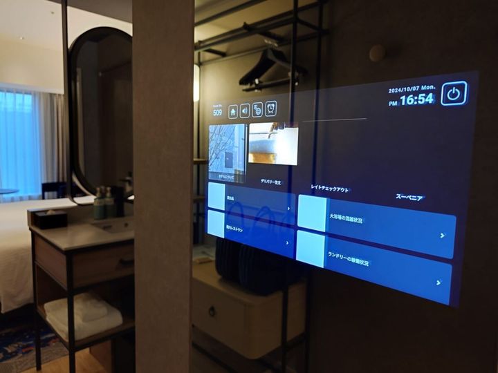 全客室の鏡は、タッチパネルの「スマートミラー」になっています。ホテル情報や観光情報をチェックするだけでなく、ルームサービスの注文、2階の大浴場の混雑具合やコインランドリーの使用状況のチェック、目覚まし時計の設定など、多機能を搭載しています!