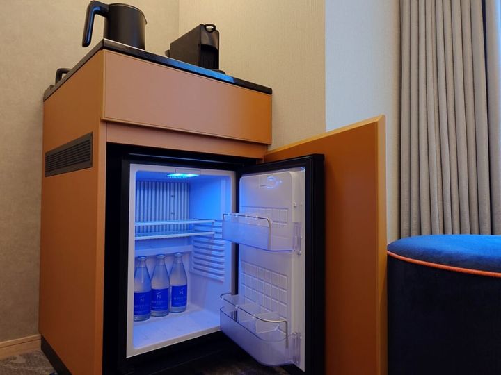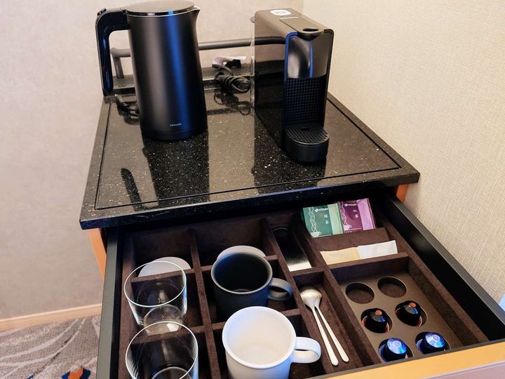 湯沸かしポット、ネスプレッソのコーヒーマシンもあり、引き出しの中には、コーヒーカプセル、ミルク、シュガー、ティーバッグ(紅茶・お茶)、グラス、マグカップ、栓抜きなどがバッチリそろっています。