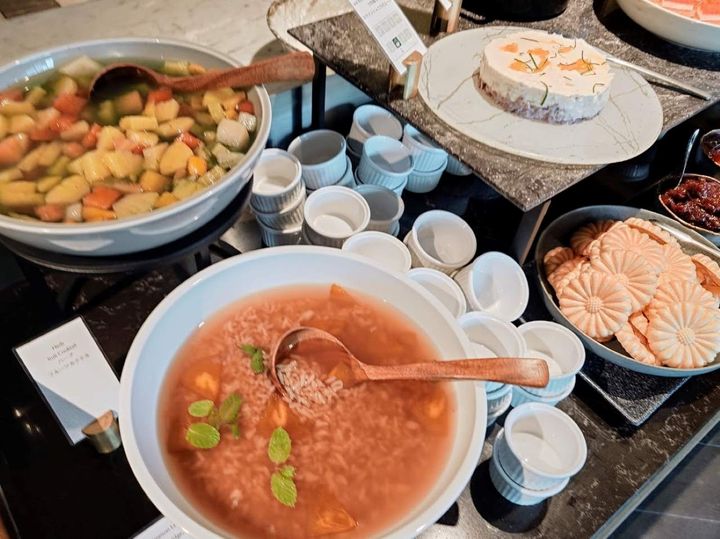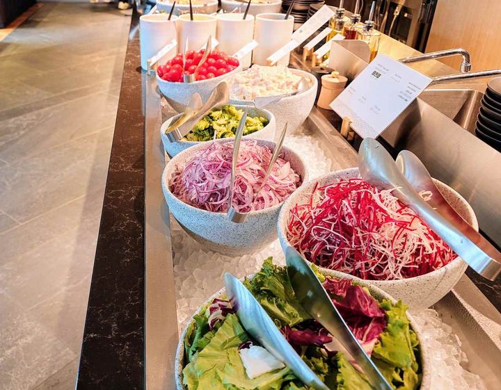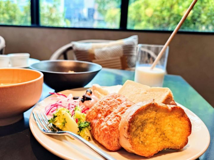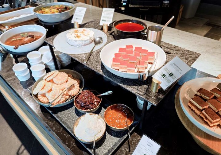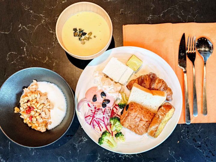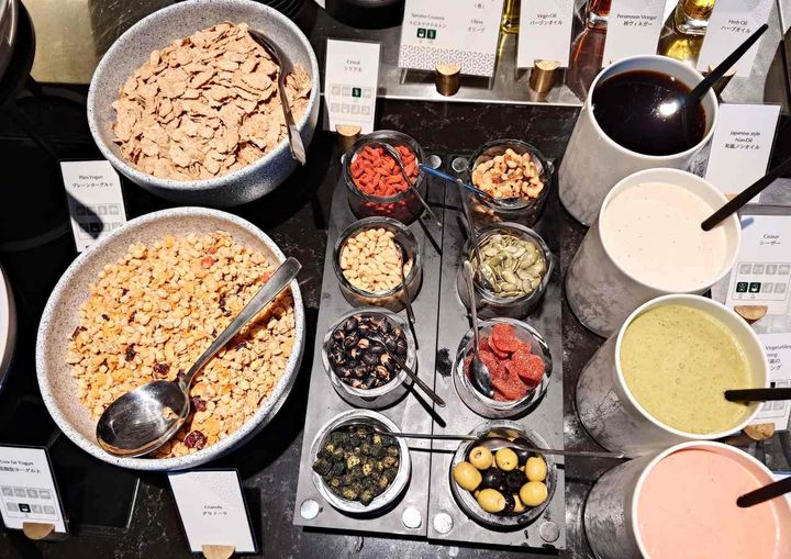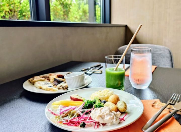 朝食は「健康と発酵」をテーマに、ホテルオリジナルの奈良漬入りポテトサラダ、大和野菜のサラダバー、パンや茶粥などヘルシーなラインナップ。バランスよく“ウェルビーイングな朝ご飯”で1日をスタート!