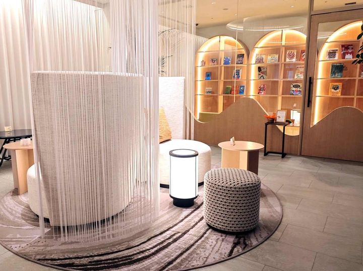 入浴後は「ウェルネスラウンジ」でリラックス。ハンギングチェアもあるオシャレな空間で、吉野檜やマンダリンなどをブレンドした「奈良の香り」で心地よく包みこんでくれます。外から中の様子が見えるキッズスペースもあるので親子でのびのびと過ごせそう。