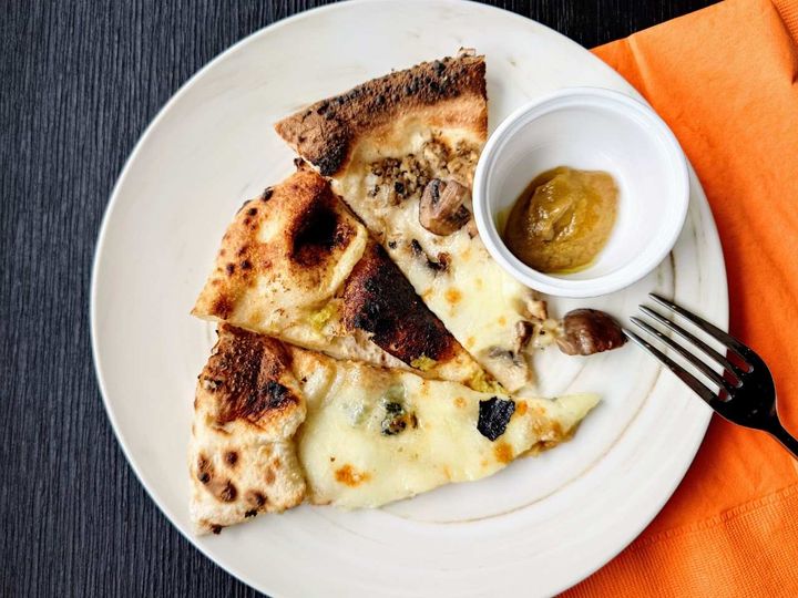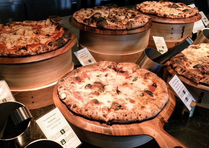 この日は、天日干しトマトのマルゲリータ、大和野菜のピザ、奈良原木しいたけとラルド(イタリア語で豚の背脂のこと)の旨味が効いたピザ、発酵ジャガイモソースに井ゲタ醤油のミストをかけてわさびがツンと効いたピザなど、ここでしか味わえないものばかり。ピザは大人気で、職人さんが常に焼いていました!