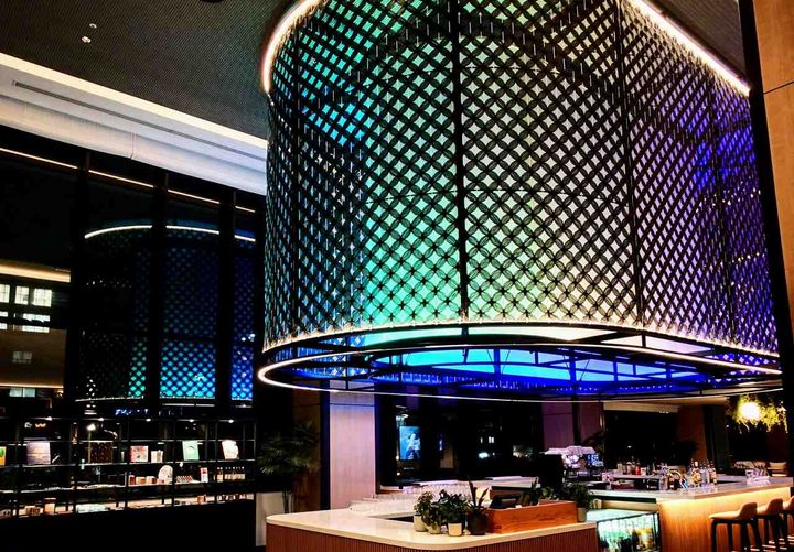 ソーシャルラウンジは、宿泊客だけでなく誰でも訪れることができてティータイムを過ごせます。印象的な頭上の大きな照明は行灯をモチーフに七宝柄を施していてかっこいい!