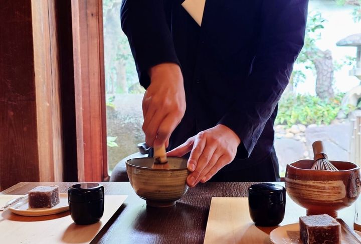 自分で抹茶を点てて、老舗銘菓「樫舎」の季節和菓子と共に一服できる体験「自点てセット」(税込3,300円・体験60分)。先生から、茶器、抹茶、作法、お菓子についてお話があり、座敷からお庭を眺めて心が穏やかなひとときに。