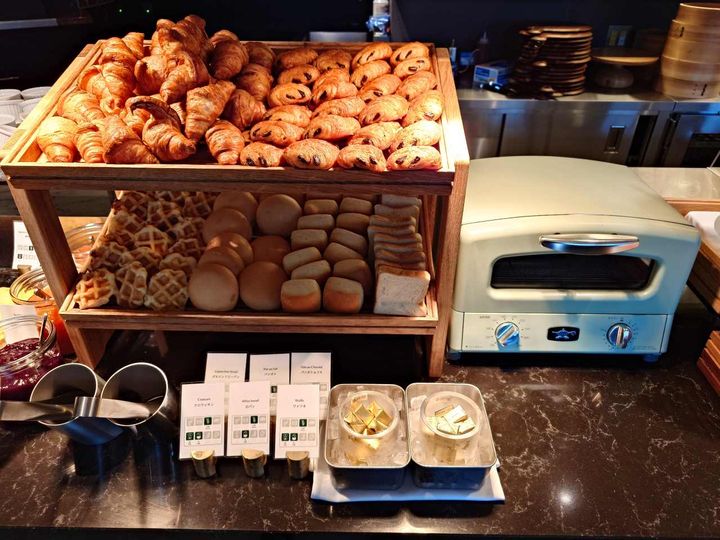 焼きたてパンはトースターで焼き直しもOK。クロワッサンやグルテンフリーのパンなど6種類あり、“動物性・植物性”の2種類のバターやジャムもあります。