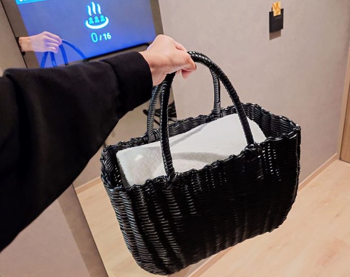 客室のスマートミラーで「2階・大浴場の混雑状況を客室のチェックしたら、籠バッグにタオルや着替えを入れてレッツゴー! 客室にある館内案内に書かれた大浴場の暗証番号は忘れずに!