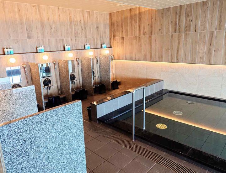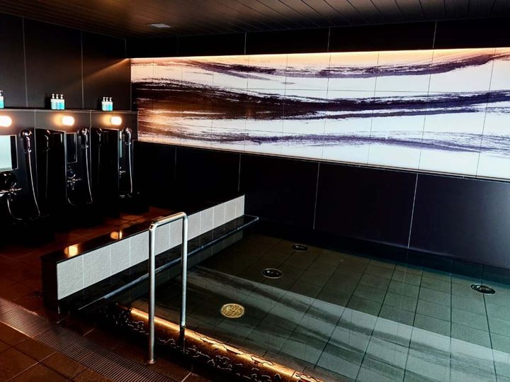 筆が走るシックなデザインの「女湯」。男女共にお風呂には、客室と同じくシャンプー・リンス・ボディソープをセット。
