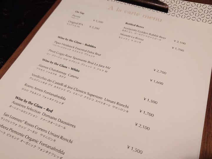 ソフトドリンク、コーヒー・紅茶、カクテルやワインのお酒系まで多種多様(税込800円~)、ナッツやチョコレートなどちょっとしたおつまみ(税込660円~)も。