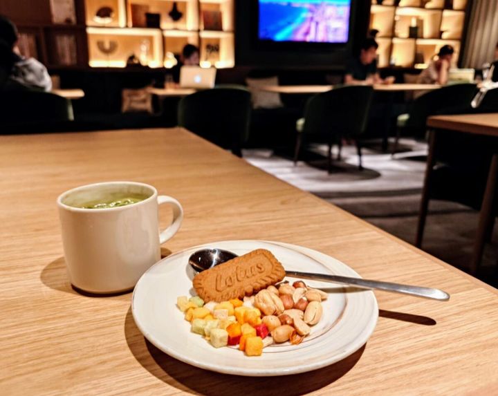 バーカウンターにはナッツやクッキー、サラミやパンなどが並び、軽食とドリンクは無料で楽しめます(メニューは時間帯によって異なります)。17時〜18時30分まではお酒のフリーフロータイムという贅沢な時間帯も!