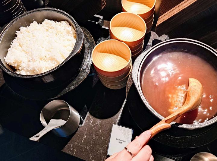 柿の葉寿司、奈良漬、大和野菜の漬物、自分で挽く鰹節、野迫川村のわさび、月ヶ瀬の梅干し、温泉卵、大和大鉄砲大豆の豆腐という和のおかずを小皿に盛って、茶粥や白米に少しずつのせてお茶漬けに自分流にアレンジを。