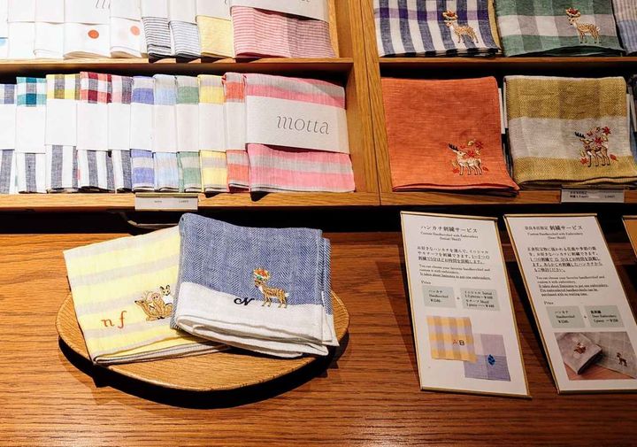 「中川政七商店 奈良本店」では、奈良本店限定商品も多数そろえ、ハンカチの刺繍サービスも行っています。