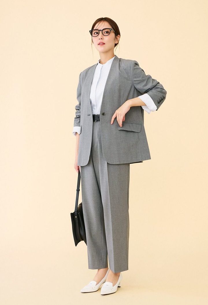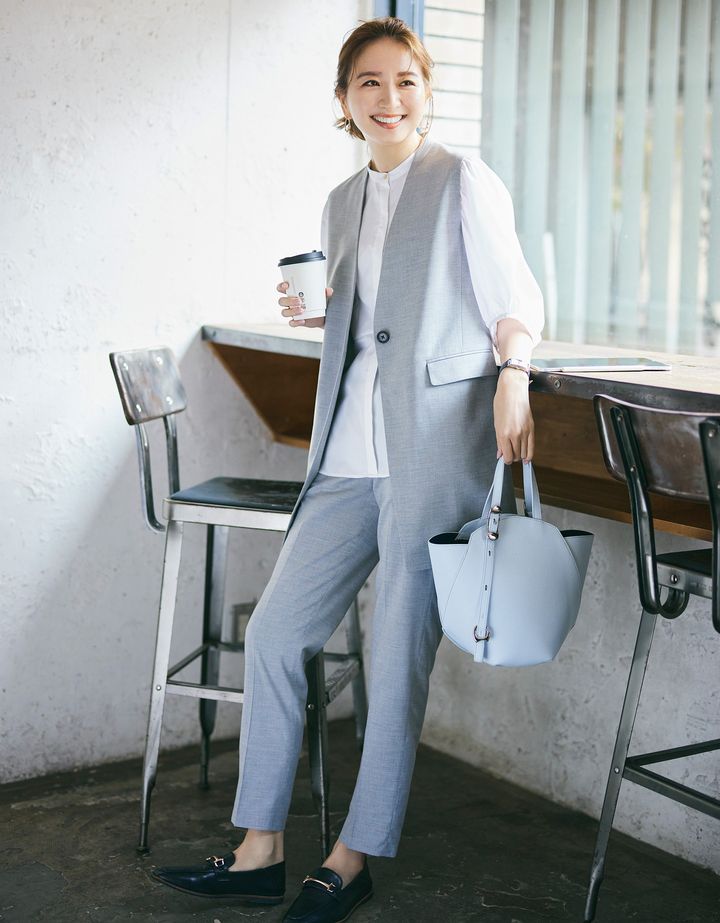 ノーカラー&シングルボタンのシンプルなジレと、スラッと美脚に見せてくれるクロップト丈パンツのセットアップ。パッと印象を明るくしてくれるライトグレーなら、すっきりとキレイめに着られます。全体的にマニッシュなぶん、ボリューム袖の白ブラウスや華奢なアクセサリーで女性らしさを投入して。