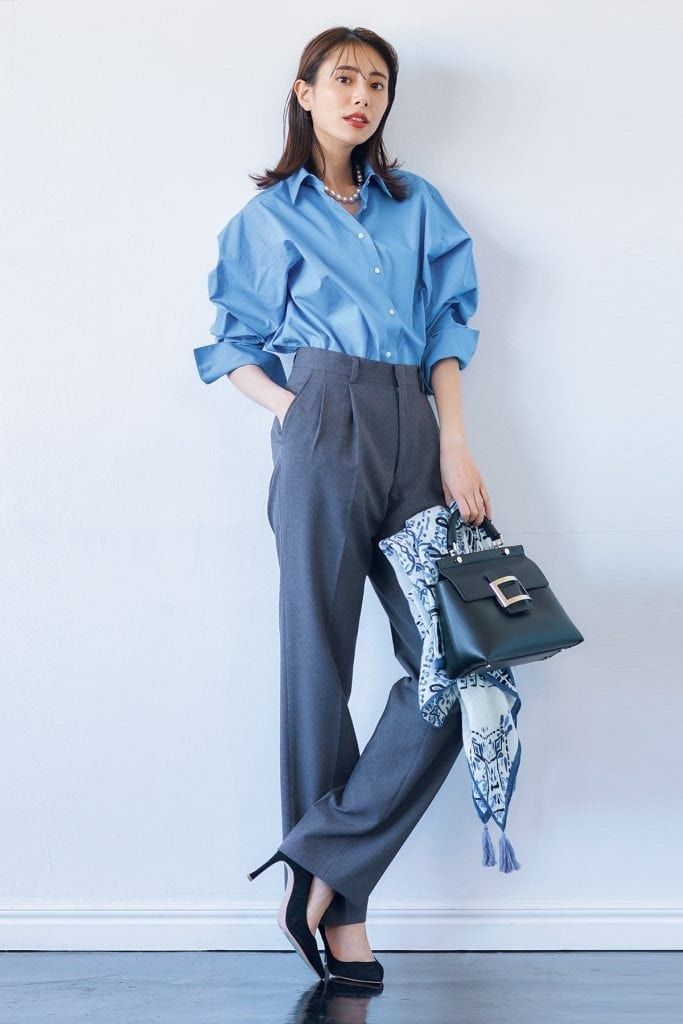 定番のシャツ×パンツコーデも、配色次第で今っぽく刷新が可能。パキッとしたブルーにシャープなグレーパンツを合わせれば、シンプルでもカッコいい通勤スタイルに仕上がります。色使いがクールなぶん、パールネックレスや柄スカーフでほんのり女性らしさを足して。