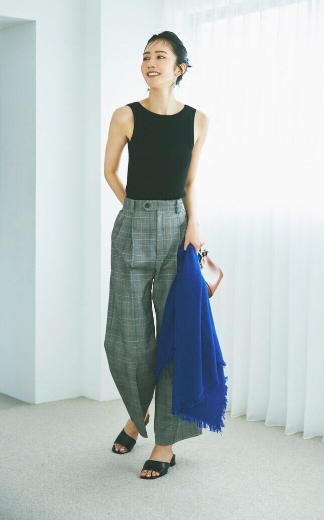 キレイめスラックスをタンク+シャツに合わせたカジュアルコーデ。グレーパンツはチェック柄をチョイスすることで、さりげなく秋らしさを先取りできます。仕上げにロイヤルブルーのストールを投入し、モノトーンスタイルを引き立てて。