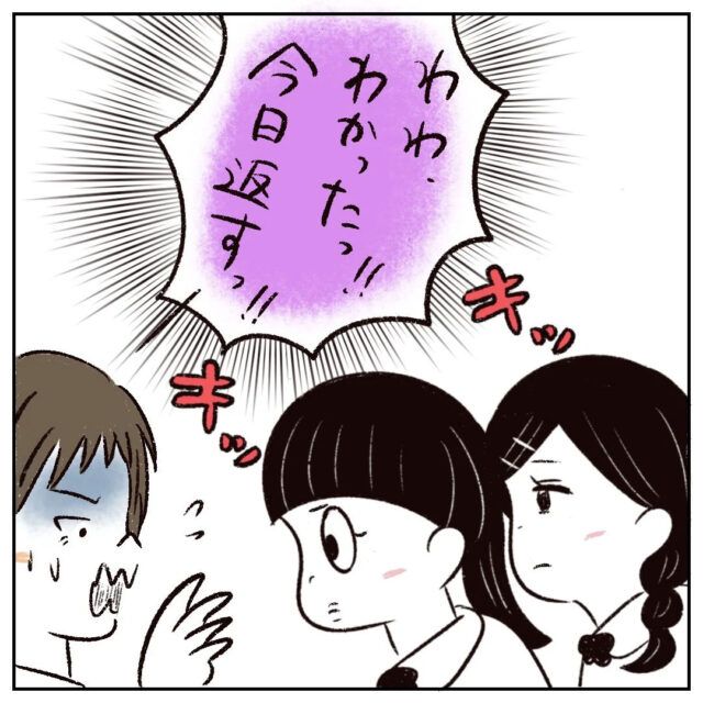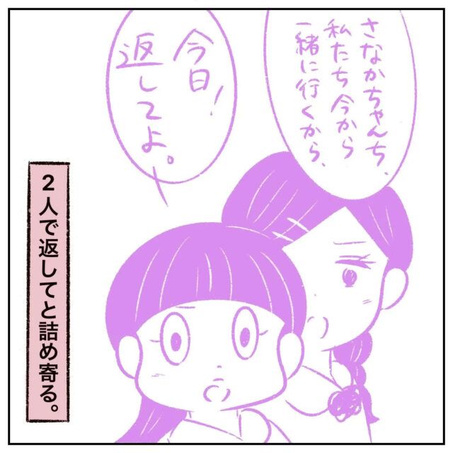 まるさんのお母さんと、友達2人に見つめられてますます焦った様子のさなかちゃんは「わわ、わかった!今日返す!」とようやく返すと言ったのでした。