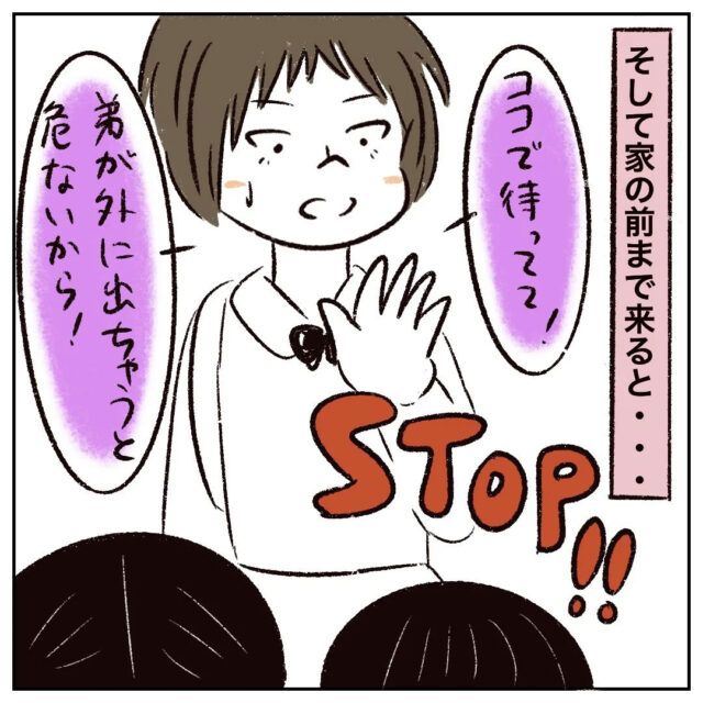 さなかちゃんの家の前に着くと、さなかちゃんは一緒に来ようとする友達を制止しました。「ここで待ってて!弟が外に出ちゃうと危ないから!」