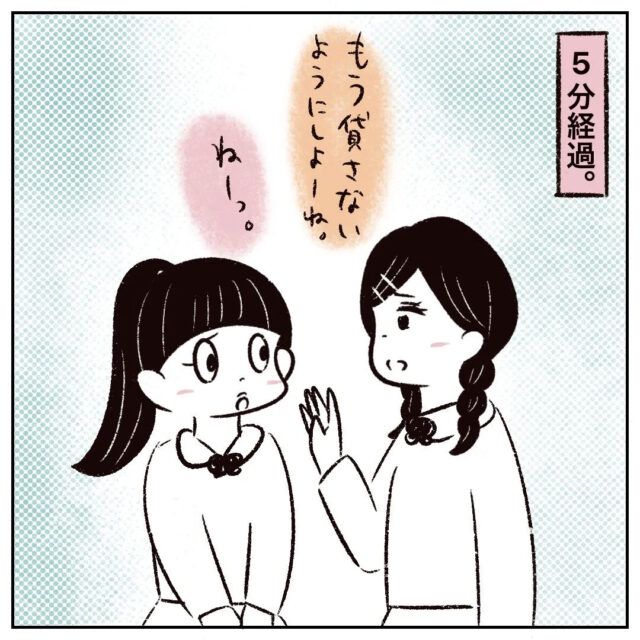 さなかちゃんに言われて家の外で待っている間、まるさんとけいこちゃんは「もう貸さないようにしようね!」とお互いに言いながら5分が経過しました。