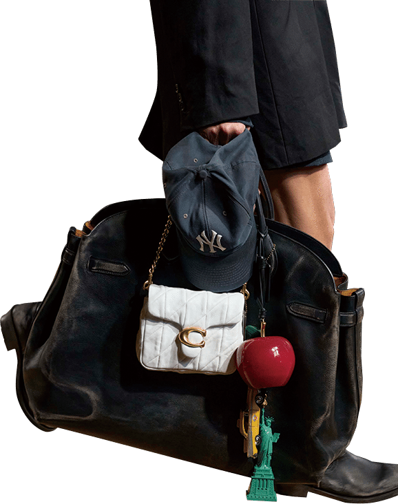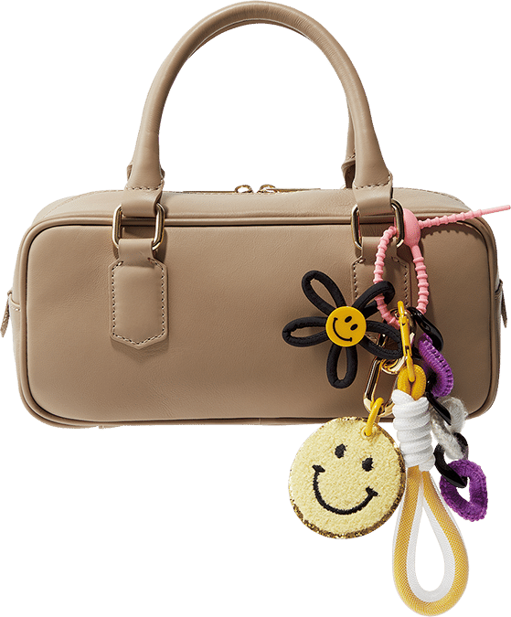 チャームは遊びがあるデザインを。バッグ[H13×W27×D12㎝]¥19,800(ミロス/ル タロン 有楽町マルイ店)、スマイルチャーム¥1,595(selectshop yolo)