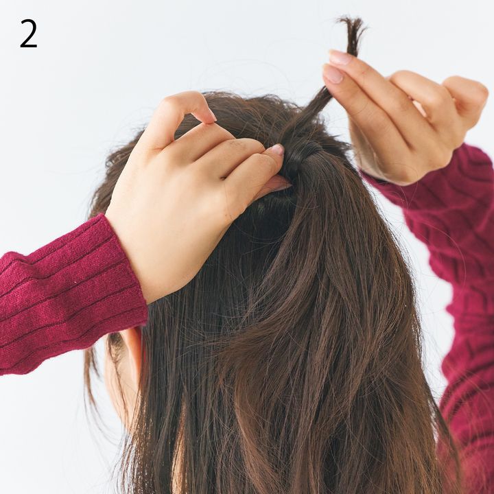 1.両耳の上とつむじを結ぶラインで髪を上下に分け、上の髪を手ぐしを使って高い位置でゴムで結び、ハーフアップに。