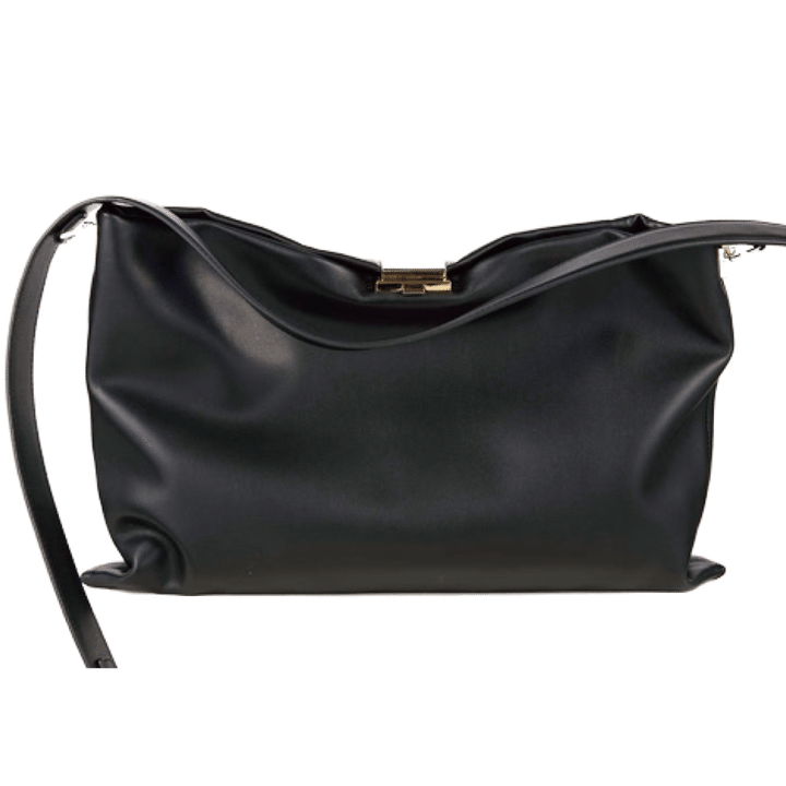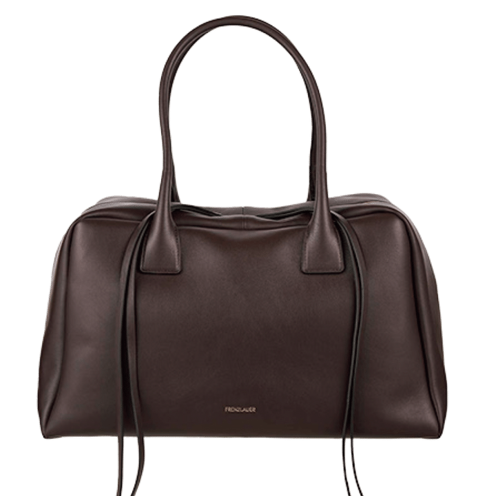 スーツでからだのバランスをキレイに見せてくれるので、崩しのポイントになるようにバッグは大きめを。茶色バッグ¥167,200(フランツロアー/デ・プレ)