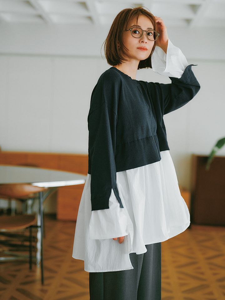 短か丈のニットとシャツが重なったレイヤードデザイン。長さもあるのでお尻はしっかり隠してくれます。裾にシャツ生地をたっぷり使い、ボリューム感が高見えします。