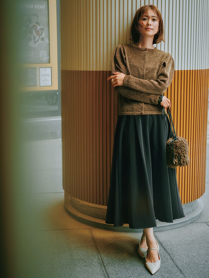 <写真3枚目>スカート¥12,100(S・girasole)ニット¥14,960(Jines /ジオン商事)バッグ¥22,000(ヴィオラドーロ/ピーチ)シューズ¥17,600(ダイアナ ウェルフィット/ダイアナ 銀座本店)ピアス¥22,000(フェリーニュ/フォーティーン ショールーム)