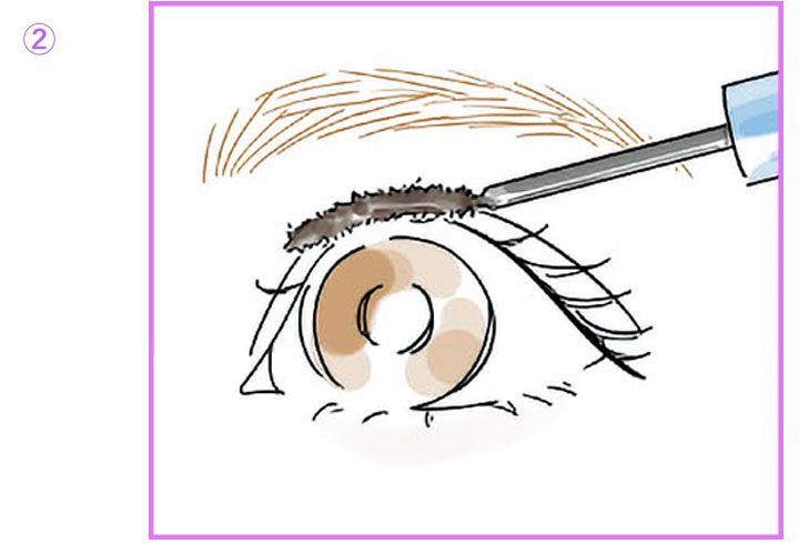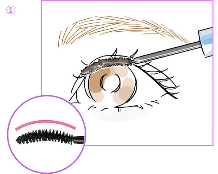 ブラシのカーブ側を上にして、上まつ毛の根元にあて、まつ毛をすくうように持ち上げながらブラシを左右に小刻みに先端まで動かす。