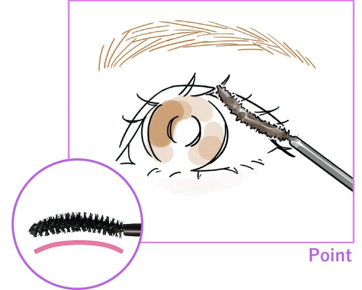 さらにロング感、ボリューム感を出したいときは、ブラシの内側を上まつ毛の根元にあて、まつ毛をすくうように持ち上げながら塗布し、カーブ側でとかすように塗ると◎。