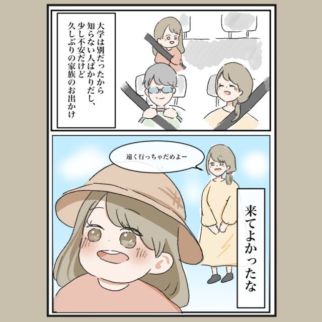「大学は別だったから知らない人ばかりだし、少し不安だけど久しぶりの家族のお出かけ」と思っていたゆうかさんは、当日を迎え、叶実ちゃんの楽しそうな様子に「来てよかった」と思っていました。