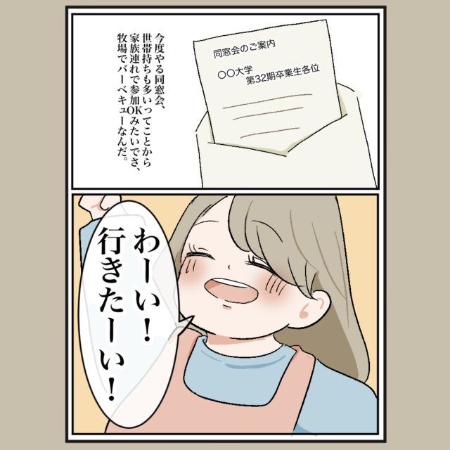 「今度やる同窓会、世帯持ちも多いってことから、家族連れで参加OKみたいでさ、牧場でバーベキューなんだ」そう言ってご主人は同窓会のご案内を差し出しました。「わーい!行きたーい!」と叶実ちゃんは大喜び!