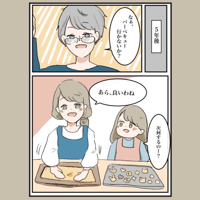 それから5年が経過したある日のこと、「なあ、バーベキュー行かないか?」ご主人の言葉に「あら、良いわね」と答えるゆうかさん、娘の叶実ちゃんとクッキーを作っていたところでした。