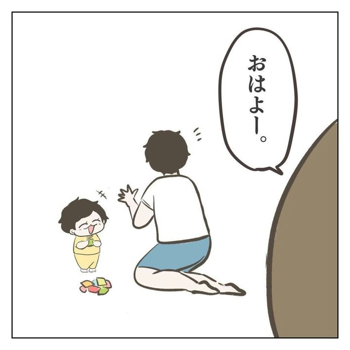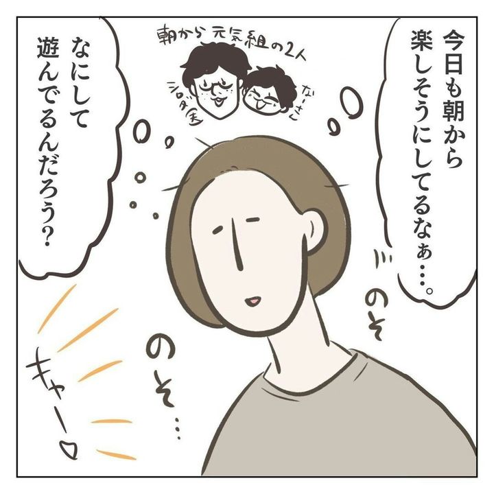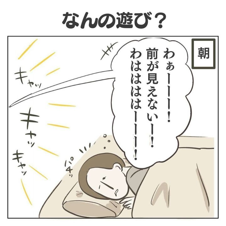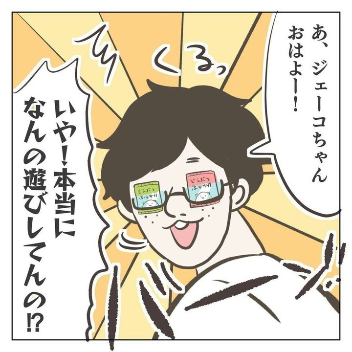 朝から息子と夫の楽しそうな声で目覚めたジェーコ(@jeeeeeeeeko)さん。なにして遊んでいるんだろう?と思いながら声のする方へ向かうと、そこには衝撃の姿をした夫がいたのでした。あなた、なにをやっているの…?