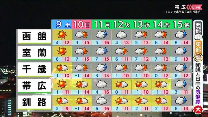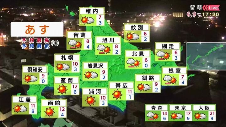 ※9日午後5時時点の情報です。最新の気象情報は、HBCウェザーセンターのホームページなどでご確認ください。HBCは気象庁の認可を2001年に得て以来、民間気象会社の一つとして「HBCの独自予報」を発信しています。