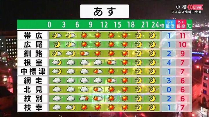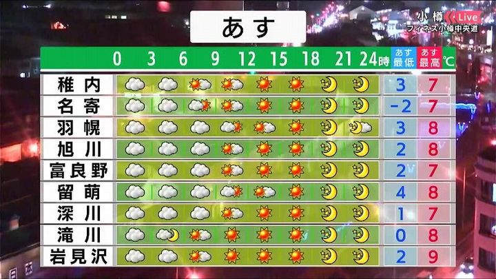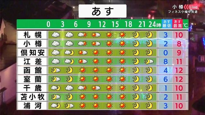 背景は8日午後5時20分ごろの小樽情報カメラ。土日は天気の崩れはなく、お出かけにも良さそうですよ。