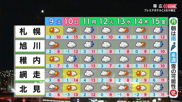 11月9日からの北海道の週間天気予報