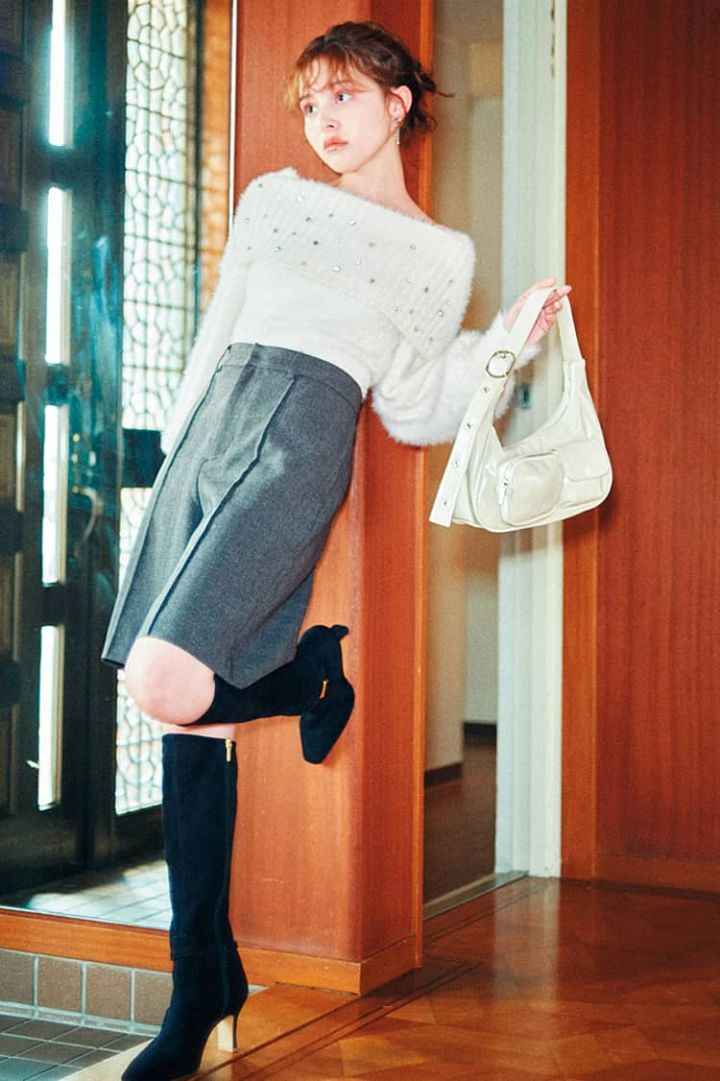 オフショルビジューシャギーニット 8,800円/rienda(バロックジャパンリミテッド) グレーハーフパンツ 4,389円/ROPÉ PICNIC(ジュン) イヤリング 2,090円/GOLDY バッグ 7,150円/アネモネ(サンポークリエイト) ロングブーツ 49,500円/タラントン by ダイアナ(ダイアナ 銀座本店)