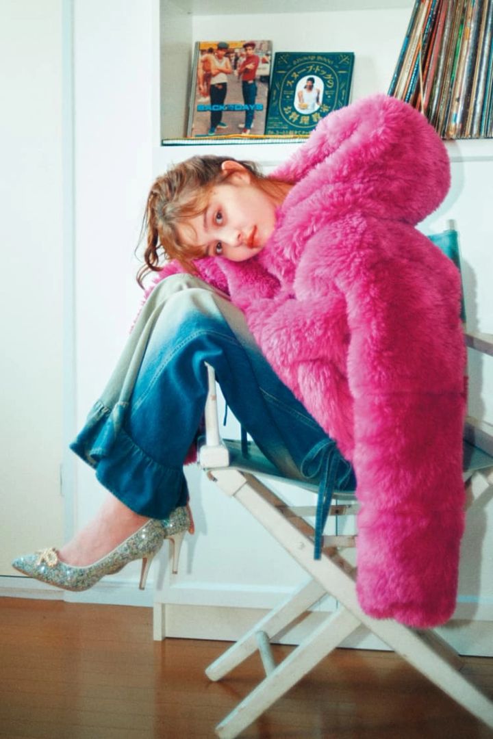 ピンクファーダウンコート 50,600円/アグ×レイ ビームス(レイ ビームス 原宿) リボンデニムパンツ 14,300円/merry jenny パンプス 18,150円/ダイアナ(ダイアナ 銀座本店)