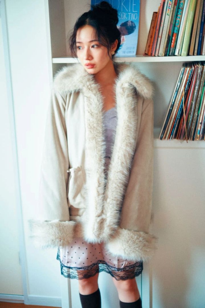 ベージュフェイクファースエードコート 20,900円/TINA:JOJUN パープルレースニットビスチエ 2,199円/WEGO ベージュドットサテンスカート 7,090円/NADIA FLORES EN EL CORAZON イヤリング 1,980円/Osewaya(お世話や) ハイソックス 1,320円/靴下屋(Tabio)