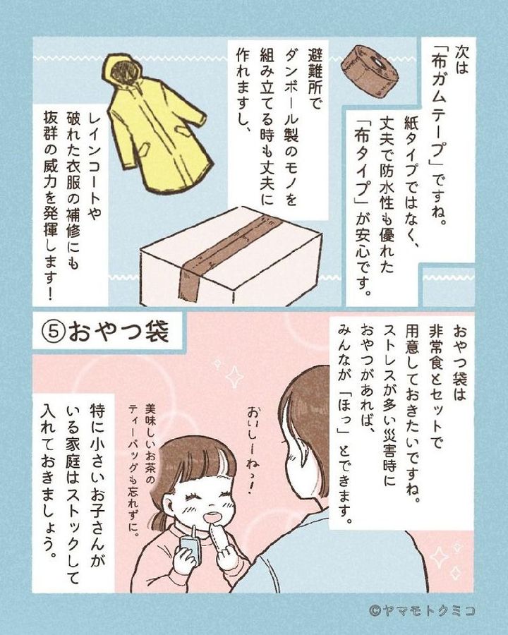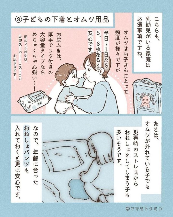 ヤマモトさんは、「普段はオムツを不要としている子どもでも、災害時のストレスで、おねしょをしてしまうことも多いんです。防水加工が施されたおねしょパンツも入れておくとさらに安心できるかもしれません」と話します。