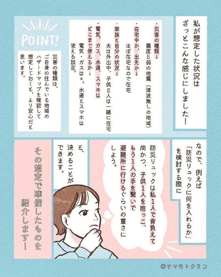 ヤマモトさんによると、防災用品を準備するにあたって、大切なのは「災害時の状況を想定」することだといいます。