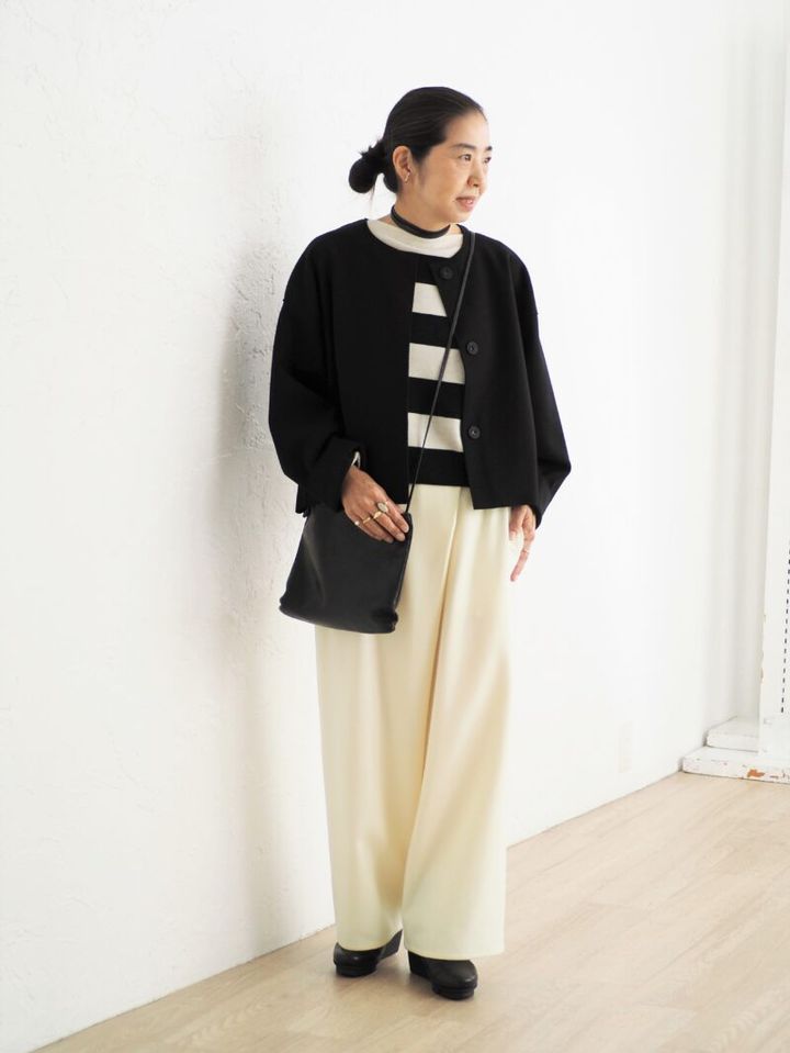 ウールのような風合いのジャケットとパンツは温かみがあり、秋冬の着こなしにぴったり。「涼しくなってくると、コントラストがきいたコーディネートがしたくなるんですよね。ジャケットはショート丈でバランスが取りやすく、かなり使えると思います」と三好さん。ボーダーニットを合わせることで、キメキメになりすぎず、ほどよい抜け感を演出。