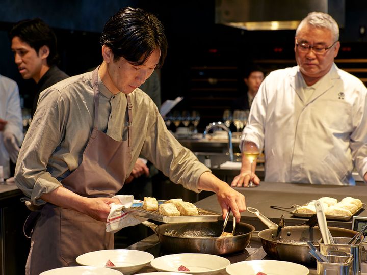 今回は著名店のシェフやソムリエを招き、『京都吉兆』徳岡邦夫総料理長と、発酵をテーマとするモダンフレンチ『TOUMIN』の井口和哉シェフのふたりが、ポメリーの各シャンパーニュに合わせて料理を創作するワークショップを開催した。