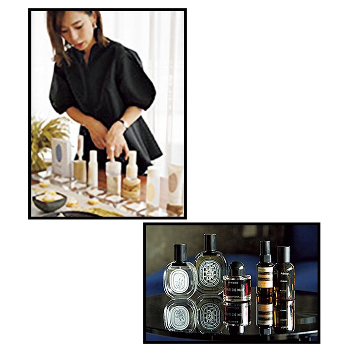 (写真右)良質な睡眠を導くディプティックや、イソップのルームフレグランスは、体調や気分で使い分け。